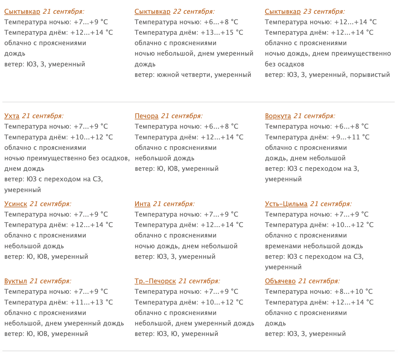 В Сыктывкаре 21 сентября облачно с прояснениями. Дождь. Ветер юго-западный, западный 4-9 м/с, днем 7-12 м/с. Температура ночью +7...+9°С, днем +12...+14°С.