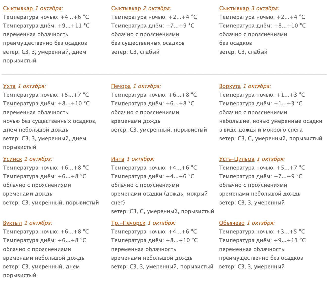 В Сыктывкаре 1 октября переменная облачность. Преимущественно без осадков. Ветер северо-западный, западный 5-10 м/с, днем порывами до 14м/с. Температура ночью +4...+6°С, днем +9...+11°С.