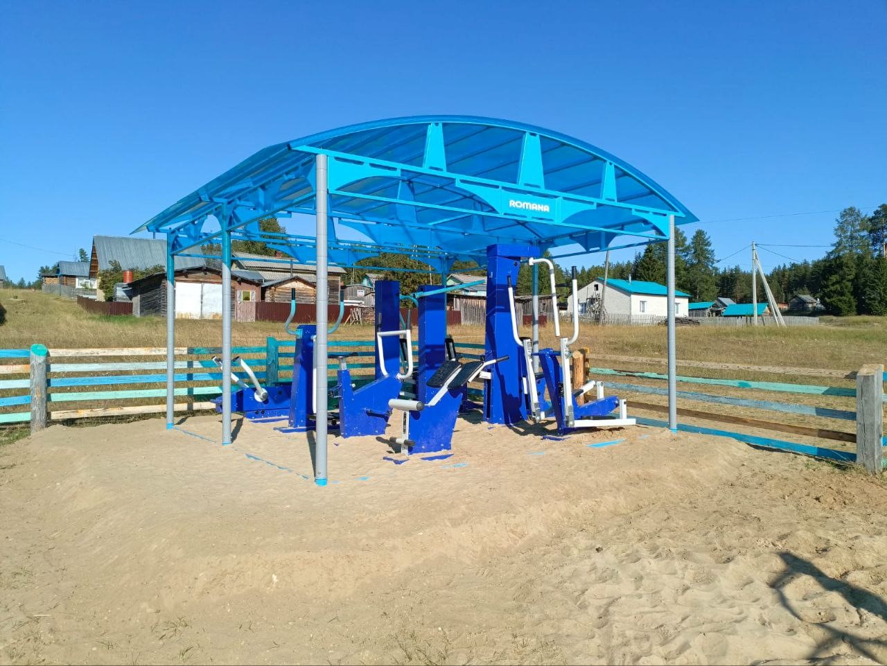 Силами жителей поселка и местных предпринимателей была подготовлена площадка под тренажеры, установлены теневой навес и тренажерный комплекс.