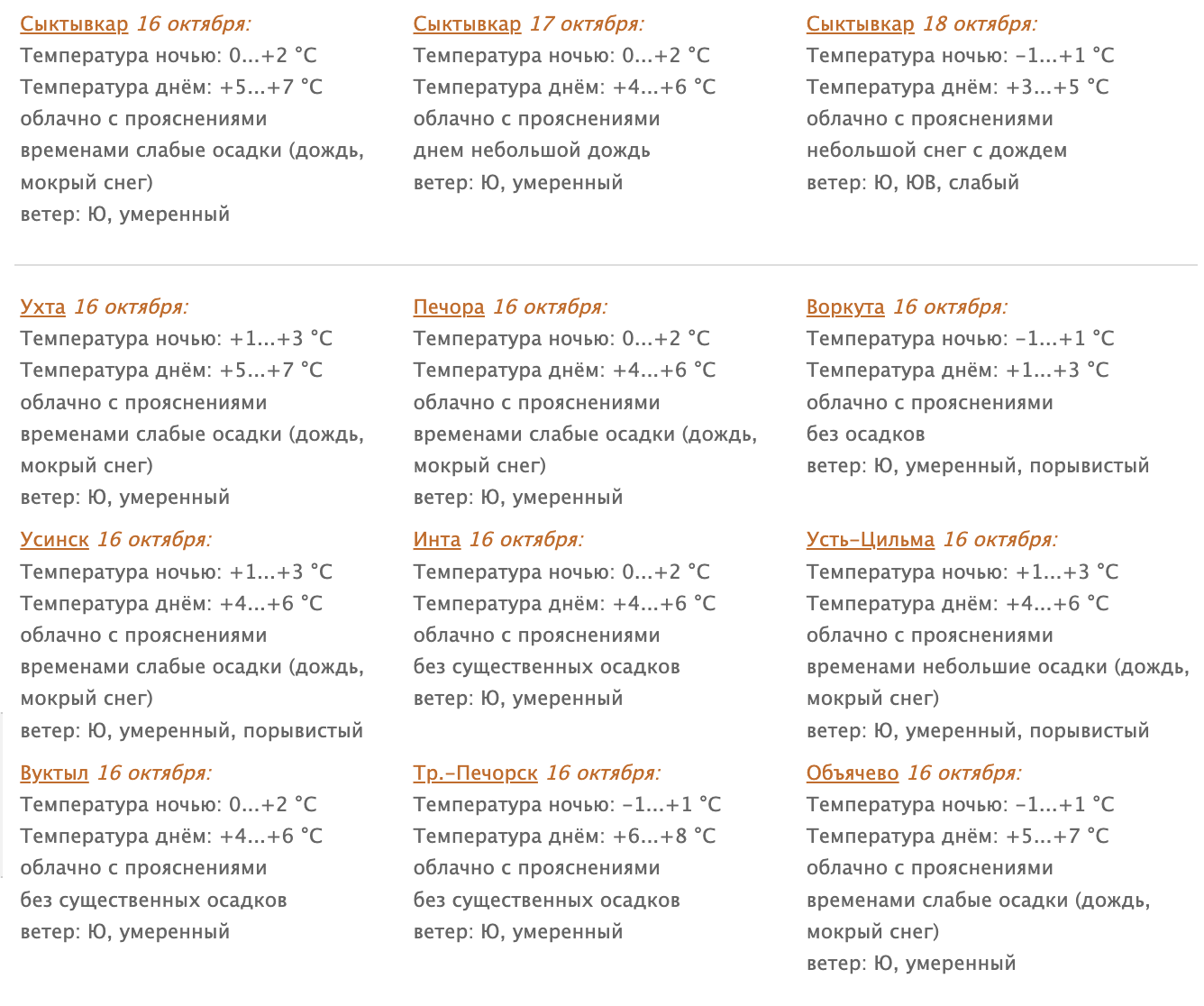 16 октября в Коми облачно с прояснениями, временами небольшие осадки (дождь, мокрый снег).