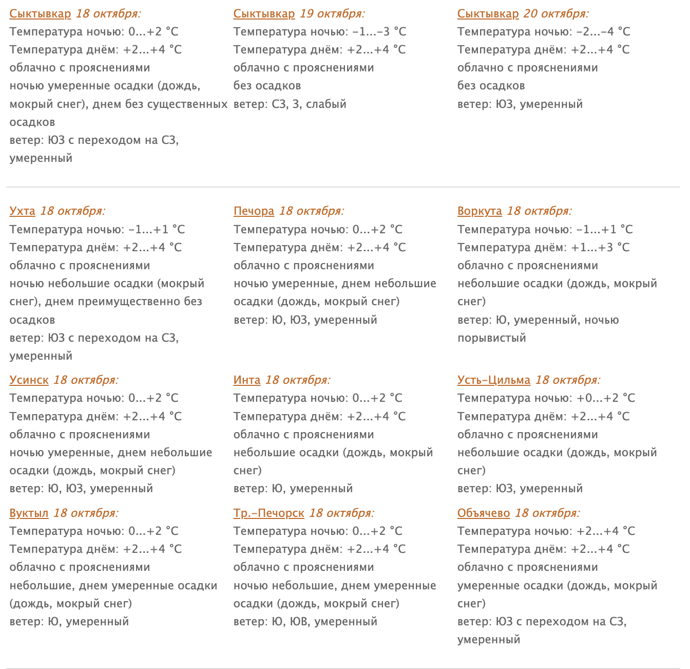 В Сыктывкаре 18 октября облачно с прояснениями. Ночью умеренные осадки (дождь, мокрый снег), днем без существенных осадков. Ветер юго-западный с переходом на северо-западный 3-8 м/с. Температура ночью 0...+2°С, днем +2...+4°С.