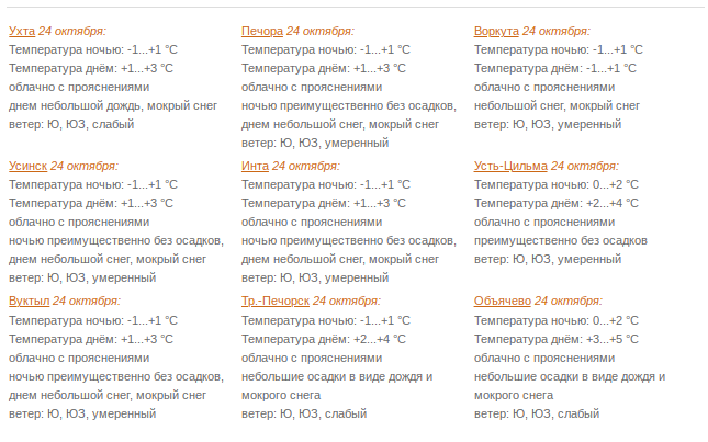 В Сыктывкаре 24 октября облачно с прояснениями. Небольшие осадки в виде дождя и мокрого снега. Ночью и утром туман. Ветер южный, юго-западный 2-7 м/с. Температура ночью 0...+2°С, днем +2...+4°С.