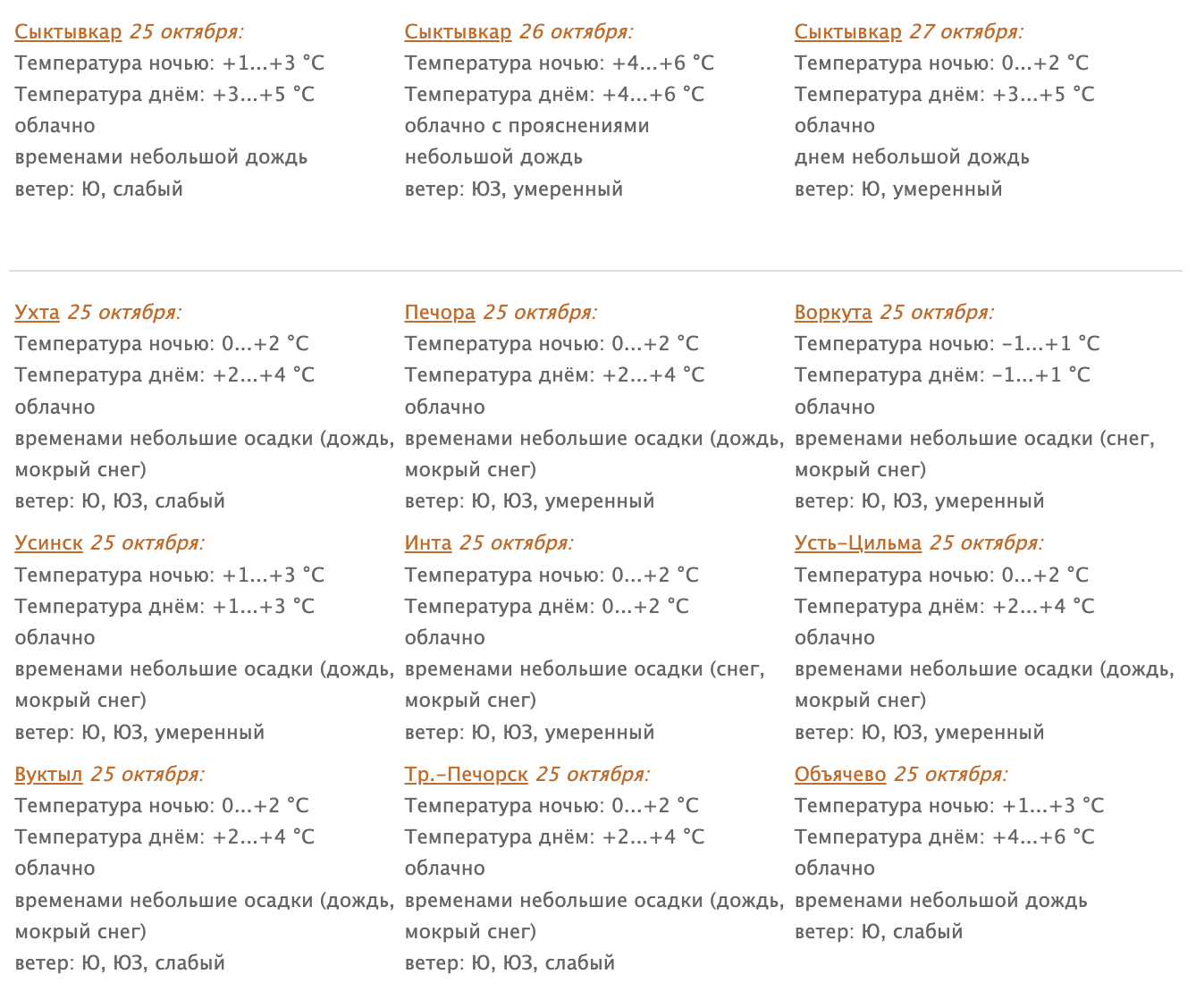 В Сыктывкаре 25 октября облачно. Временами небольшой дождь. Ветер южный 2-7 м/с. Температура ночью +1...+3°С, днем +3...+5°С.