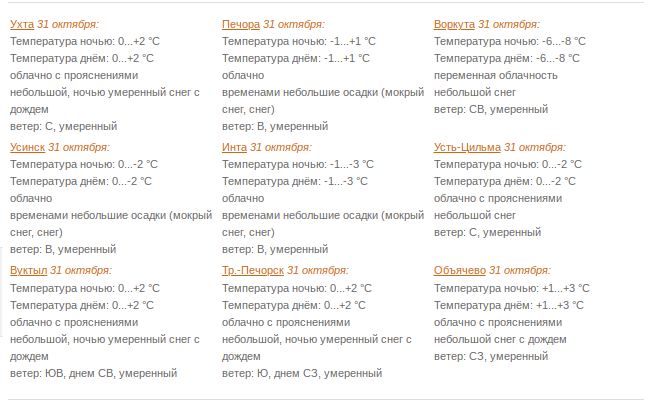В Сыктывкаре облачно с прояснениями. Небольшой мокрый снег. Ветер северо-западный 3-8 м/с. Температура ночью и днем 0...+2°С.