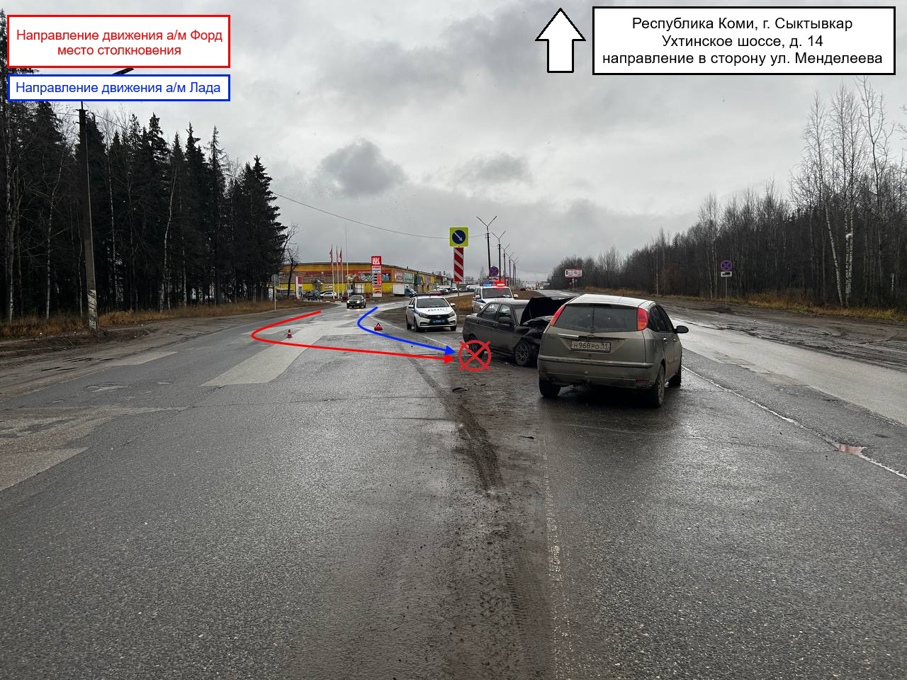 Второе аналогичное происшествие случилось в 13:30. 29-летняя девушка, управляя автомобилем Ford Focus, двигалась по Ухтинскому шоссе со стороны ул.Менделеева в направлении ул.Калинина. Напротив дома №14 по Ухтинскому шоссе, выполняя разворот, девушка не заняла нужное положение на дороге, не уступила дорогу и допустила столкновение с Lada Priora, которая двигалась сзади.