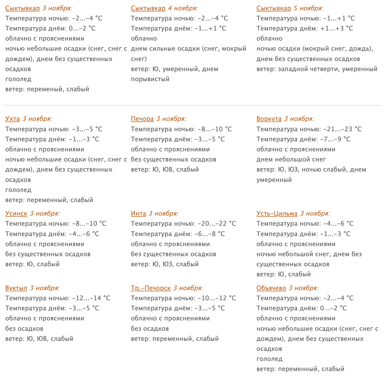 В Сыктывкаре 3 ноября облачно с прояснениями. Ночью небольшие осадки (снег, снег с дождем), днем без существенных осадков. Гололед. Ветер переменный 1-5 м/с. Температура ночью -2...-4°С, днем 0...-2°С.