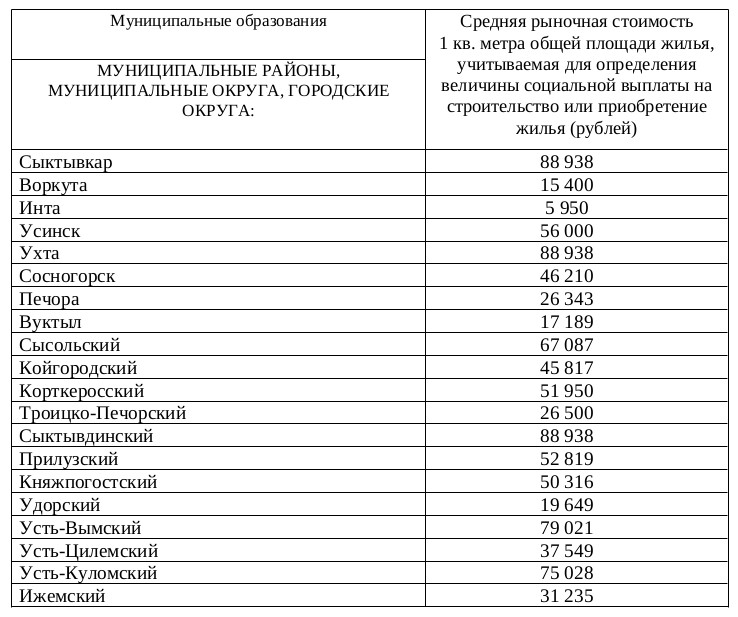 При расчете стоимости 1 кв. метра общей площади жилья на территориях администраций МО на IV квартал 2025 года были использованы фактически сложившаяся в III квартале 2025 года стоимость квадрата общей площади жилья на первичном и вторичном рынках, средняя рыночная стоимость, утвержденная приказом Минстроя РФ от 22 сентября 2025 года. Для Республики Коми эта стоимость составила 88,9 тыс. рублей, для муниципалитетов, находящихся в Арктической зоне, 117,56 тыс. рублей за квадратный метр.