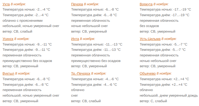 В субботу в северных районах переменная облачность. Ночью небольшой, местами умеренный снег, на крайнем севере преимущественно без осадков, днем местами небольшой снег. Ветер северо-восточный 3-8 м/с. Температура ночью и днем -4...-9°С, при прояснении -9...-14°С, в Воркутинском районе ночью и днем -15...-20°С.