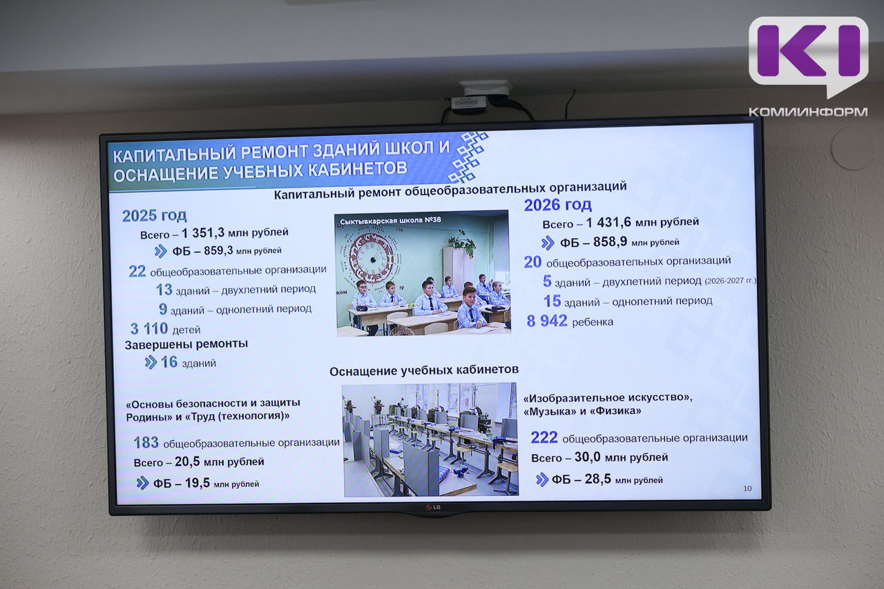 Н.Якимова рассказала, что в 2026 году на федеральные средства планируется провести капитальный ремонт в общежитии Сыктывкарского лесопромышленного техникума, оснастить оборудованием кабинеты школ по изобразительному искусству, музыке и физике, а также построить быстровозводимый жилой корпус в лагере "Черноморская зорька". В 2027 году в рамках федерального проекта "Профессионалитет" будет проведен капитальный ремонт общежития Микуньского филиала Сыктывкарского автомеханического техникума.
