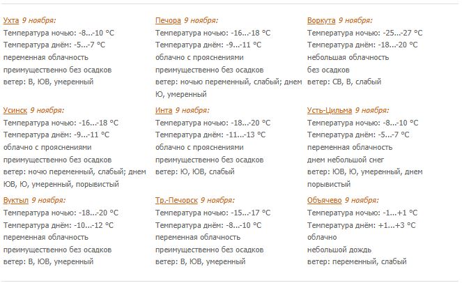 Температура ночью -8...-13°С, при прояснении -16...-21°С, днем -5...-10°С, на северо-востоке -10...-15°С. В Воркутинском районе ночью -25...-30°С, днем -16...-21°С. На юго-западе ночью -4...+1°С, днем -2...+3°С.