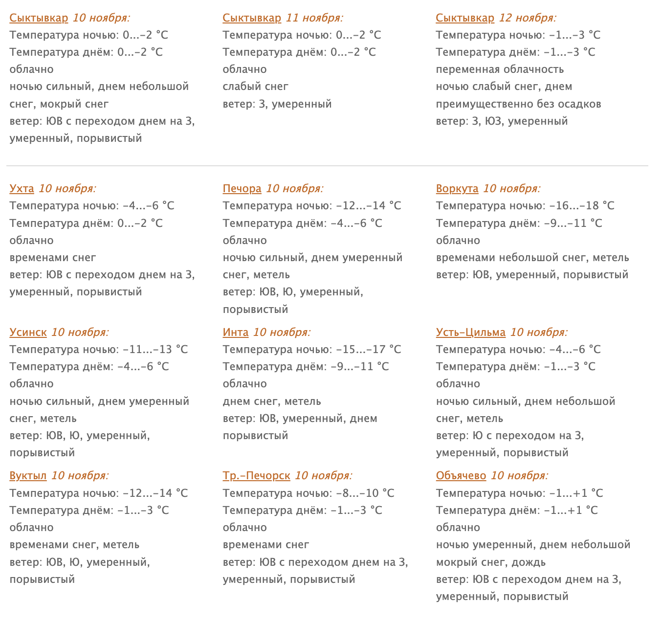 В отдельных районах гололедно-изморозевое отложение, метель. Ветер южной четверти с переходом в западной половине республики днём на западный 7-12 м/с, порывами до 14 м/с, в северных и центральных районах местами порывами 15-18 м/с, в Воркутинском районе порывами 17-22 м/с.