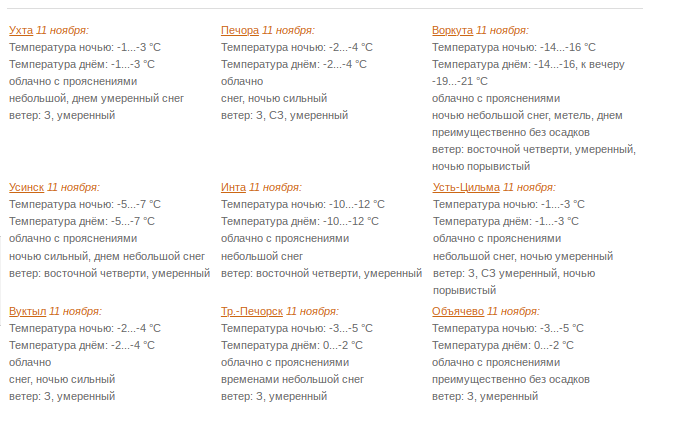 Небольшой, в отдельных районах умеренный снег, ночью на северо-востоке снег, местами сильный. Ветер западной четверти 6-11 м/с, ночью местами порывами 12-14 м/с, метель. Температура ночью и днем 0...-5°С, в Усинском районе -4...-9°С.