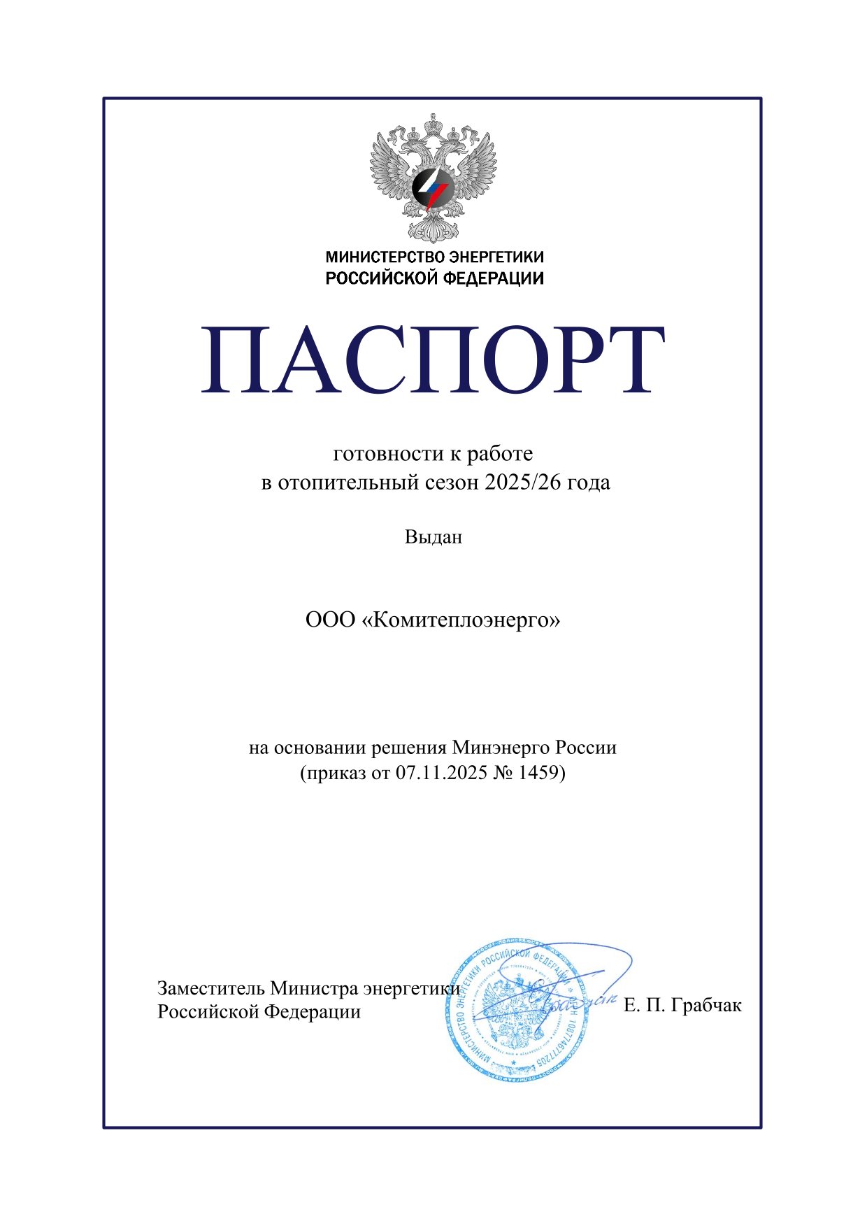 ООО "Комитеплоэнерго" получило паспорт готовности к работе в отопительном сезоне 2025/2026 года. Документ выдан Министерством энергетики России.