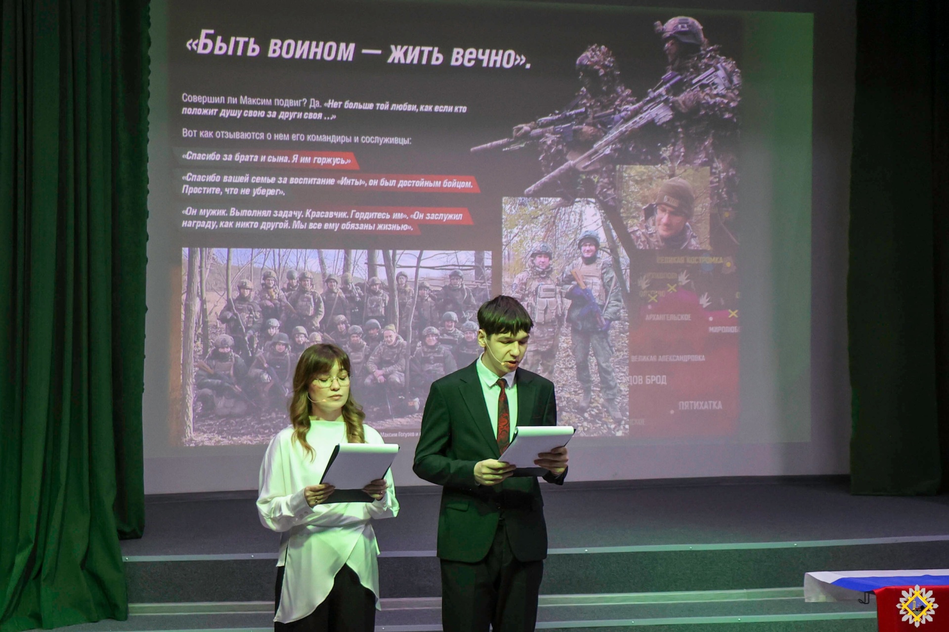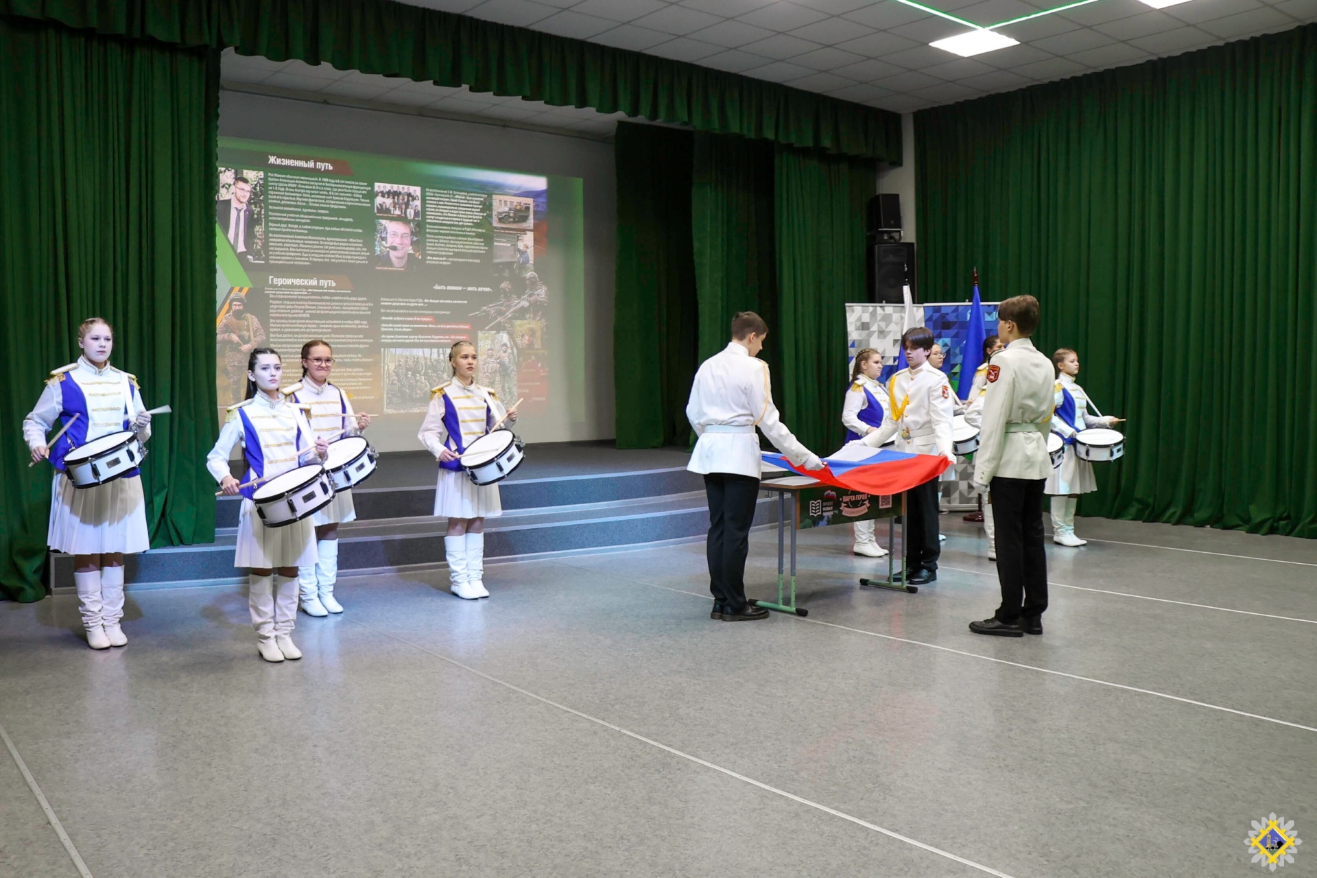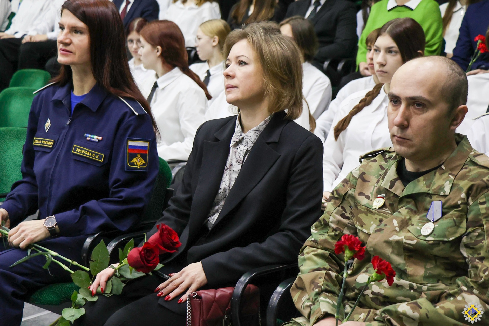 Почетное право торжественно открыть "Парту героя" было предоставлено курсантам ДОСААФ России. Присутствующие почтили память Максима Гогузева и всех воинов, павших при исполнении воинского долга, минутой молчания и возложили цветы к парте героя.