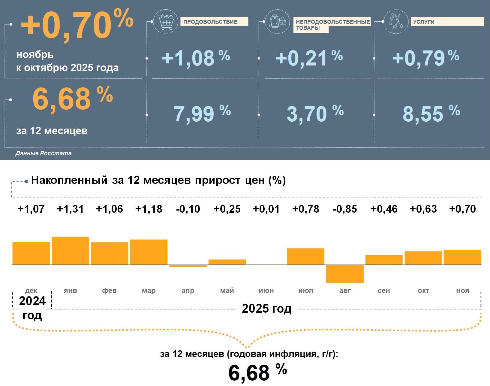 По стране в целом в ноябре годовая инфляция тоже замедлилась. Но цены все еще растут достаточно быстро. Чтобы они росли медленнее, Банк России продолжит длительное время поддерживать высокие процентные ставки в экономике. Так Банк России влияет на кредитование и сбережения с помощью решений по ключевой ставке. Под влиянием этого в 2026 году инфляция снизится до 4–5% и стабилизируется на уровне 4% в дальнейшем.