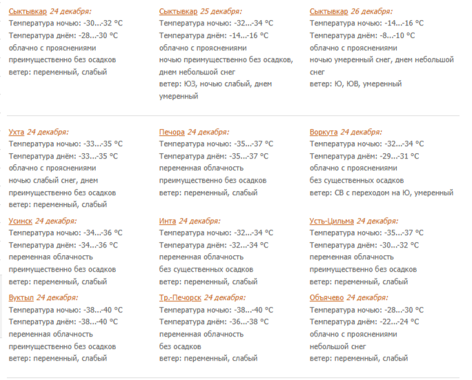 В Сыктывкаре 24 декабря облачно с прояснениями. Преимущественно без осадков. Ветер переменный 1-5 м/с. Температура ночью -30...-32°С, днем -28...-30°С.