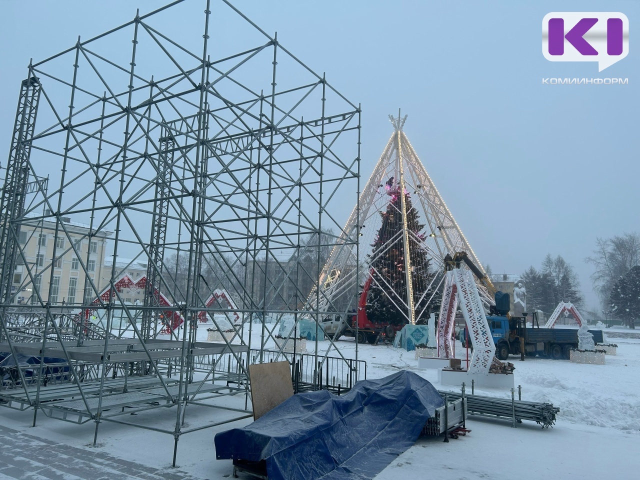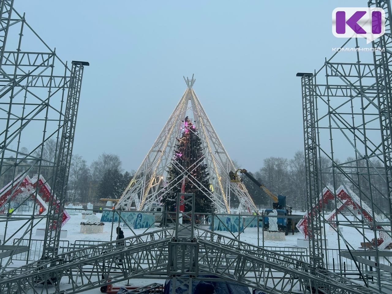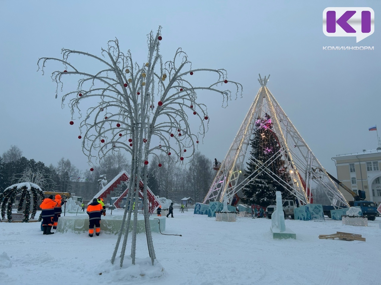 В Сыктывкаре обустройство новогоднего городка на Стефановской площади вышло на финишную прямую - специалисты продолжают тестировать системы светомузыкального оборудования, рабочие очищают площадку и убирают ограду.