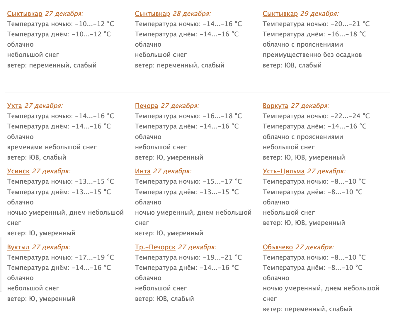 В Сыктывкаре 27 декабря небольшой снег. Ветер переменный 1-5 м/с. Температура ночью и днем -10...-12°С.