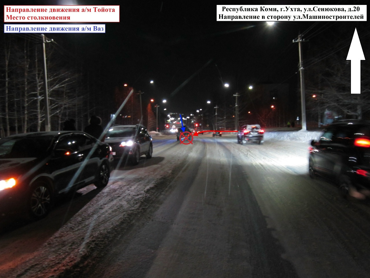 В Ухте в 15:00 водитель Toyota 1960 г.р. при выезде с прилегающей территории д. 55 по ул. Сенюкова, поворачивая налево, не уступил дорогу и столкнулся с машиной ВАЗ.