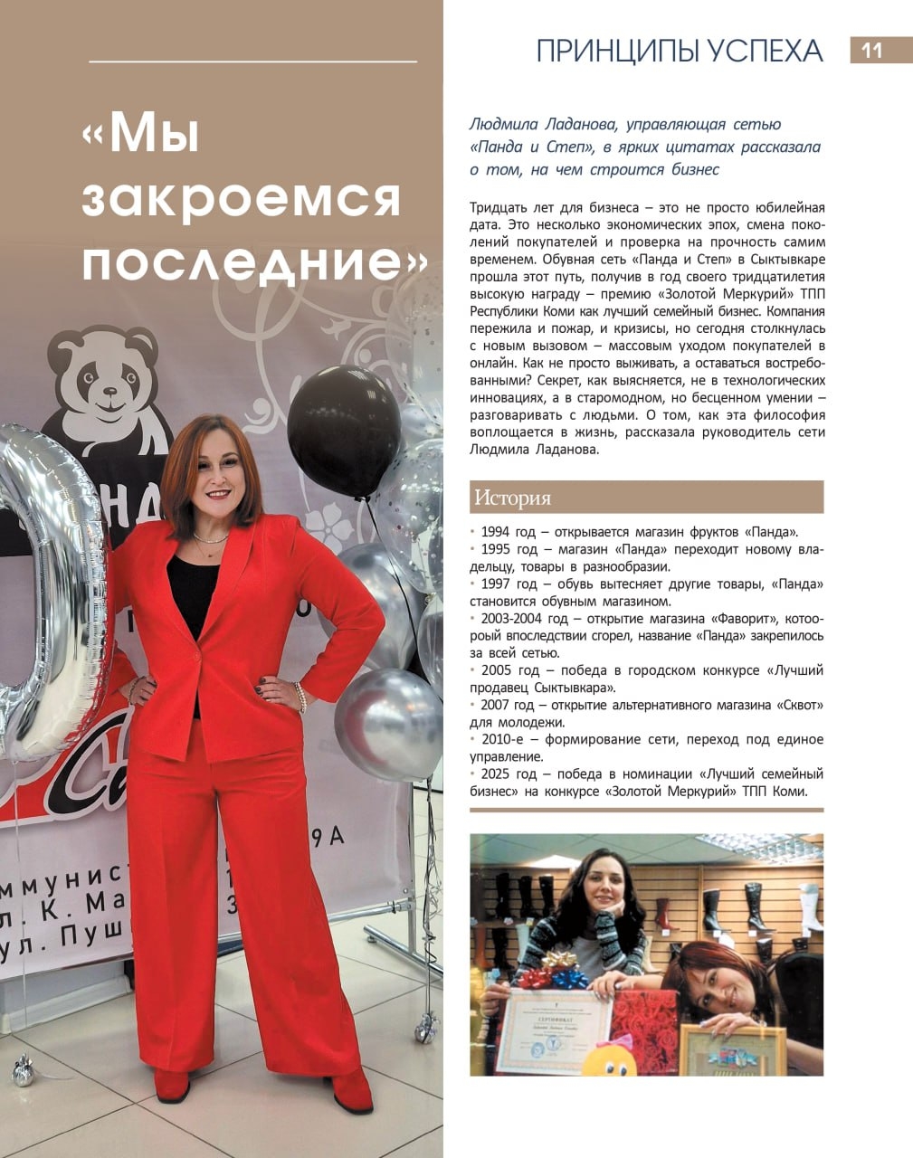 "Мы закроемся последние" - Людмила Ладанова, управляющая сетью "Панда и Степ", в ярких цитатах рассказала о том, на чем строится бизнес. Обувная сеть "Панда и Степ" в год своего тридцатилетия получила высокую награду – премию "Золотой Меркурий" ТПП Республики Коми, как лучший семейный бизнес. Компания пережила и пожар, и кризисы, но сегодня столкнулась с новым вызовом – массовым уходом покупателей в онлайн. Как не просто выживать, а оставаться востребованными? – открыла секреты руководитель сети Людмила Ладанова.