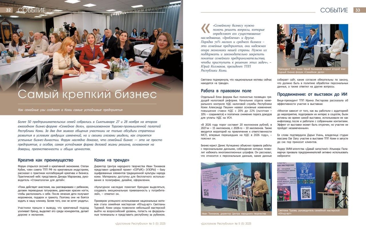 "Событием" номера стал второй бизнес-форум "Семейное дело", организованный в Сыктывкаре Торгово-промышленной палатой Республики Коми. За два дня живого общения участники не только обсудили стратегии развития в условиях, грядущих изменения, но и своими глазами увидели, как строятся успешные бизнес-династии. Форум наглядно показал, что семейный бизнес – это не просто предприятие, а особая устойчивая форма деловой жизни региона, основанная на доверии, преемственности и общих ценностях.