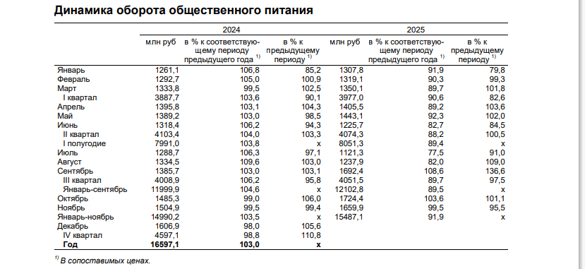 Однако общие итоги одиннадцати месяцев пока остаются в минусе. С января по ноябрь 2025-го совокупный оборот общепита достиг 15,5 миллиарда рублей, что на 8,1% меньше, чем за тот же период прошлого года.