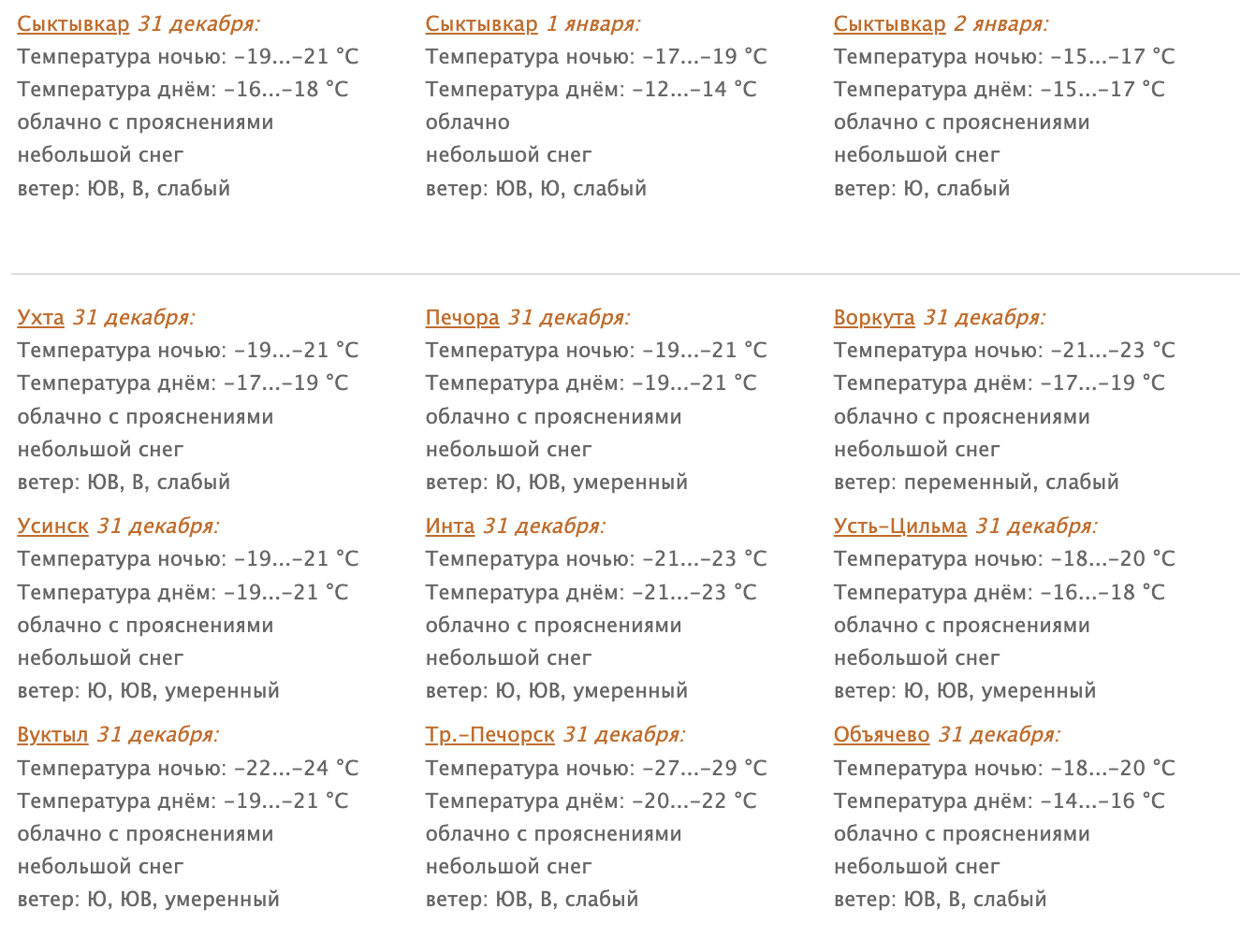 В Сыктывкаре 31 декабря облачно с прояснениями. Небольшой снег. Ветер юго-восточный, восточный 2-7 м/с. Температура ночью -19...-21°С, днем -16...-18°С.