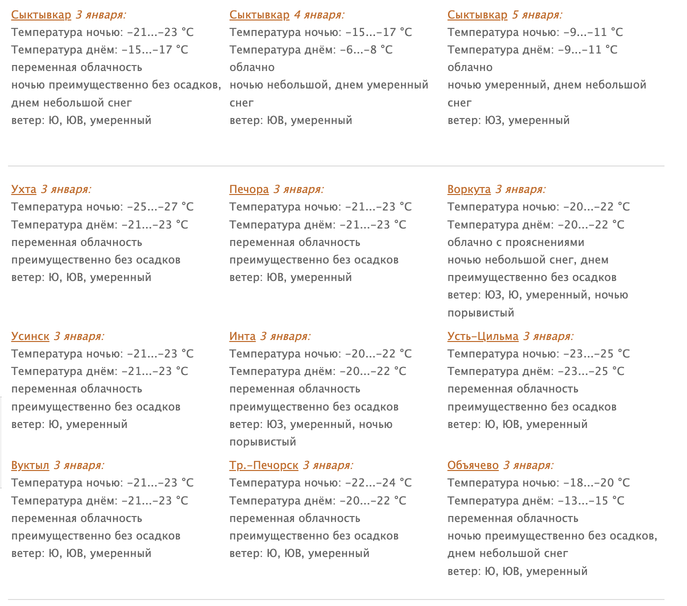 В Сыктывкаре 3 января ночью преимущественно без осадков, днем небольшой снег. Ветер южный, юго-восточный 3-8 м/с. Температура ночью -21...-23°С, днем -15...-17°С.