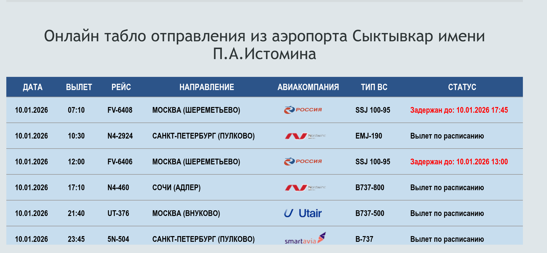 По данным онлайн-табло Сыктывкарского аэропорта имени П. А. Истомина, на текущий момент задерживается рейс FV-6408 авиакомпании "Россия" до Шереметьево — отправление перенесли с 7:10 до 17:45. Также перенесли вылет рейса FV-6406 авиакомпании "Россия" до Шереметьево: запланированный на 12:00 вылет перенесли на 13:00.