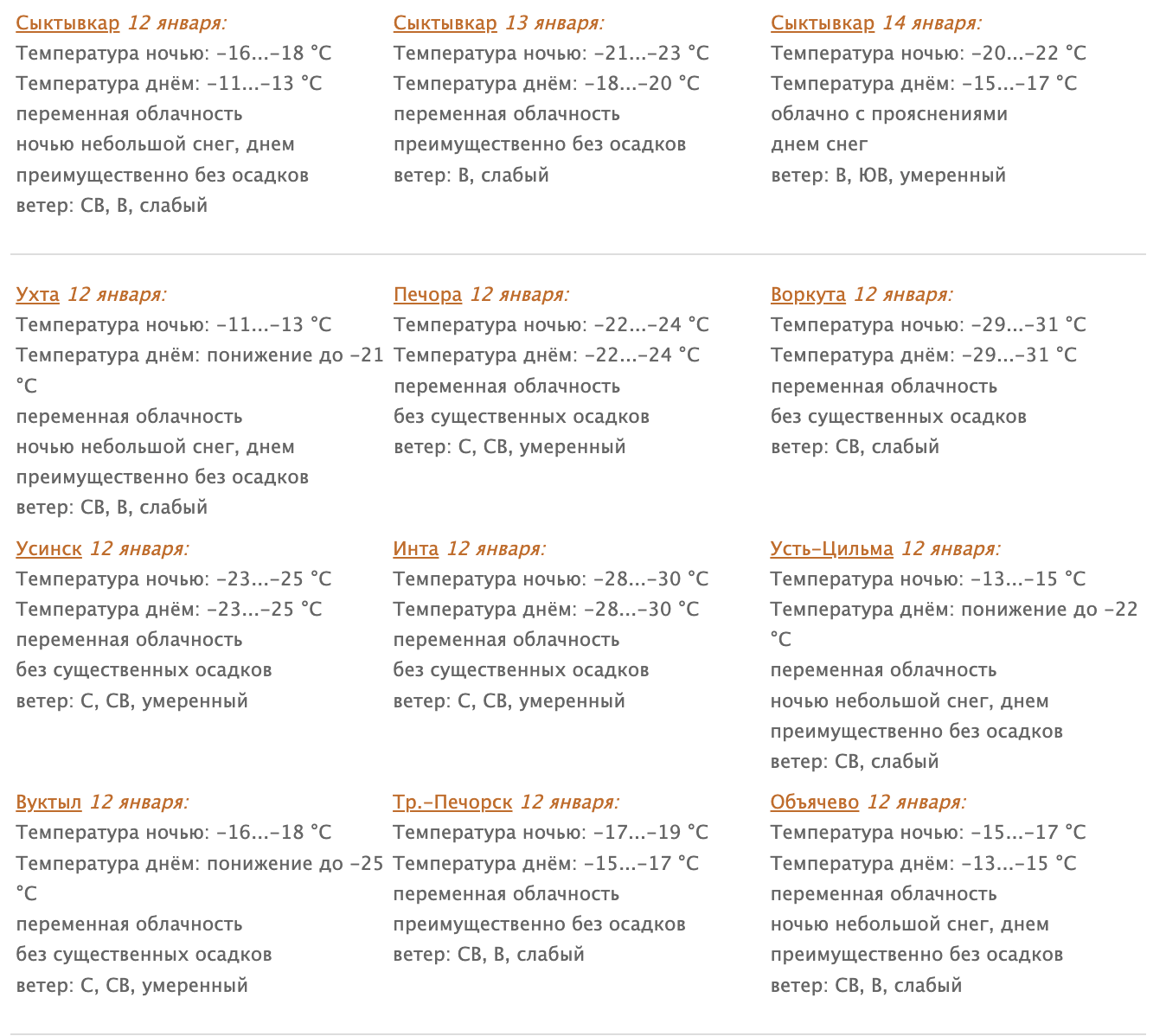 12 января в Коми переменная облачность, местами небольшой снег, ночью и утром туман, гололедно-изморозевое отложение. В Усть-Цилемском районе сохранится сильное гололедно-изморозевое отложение.