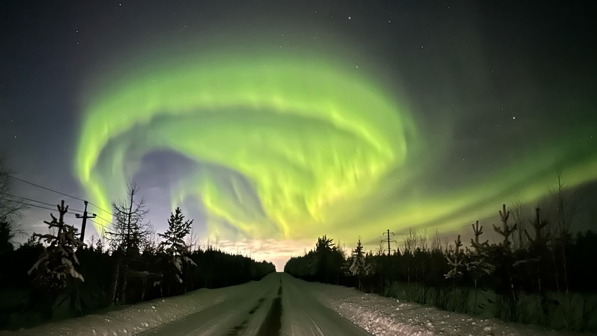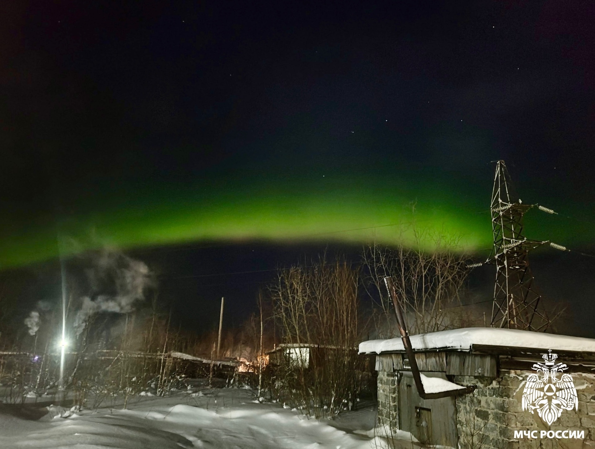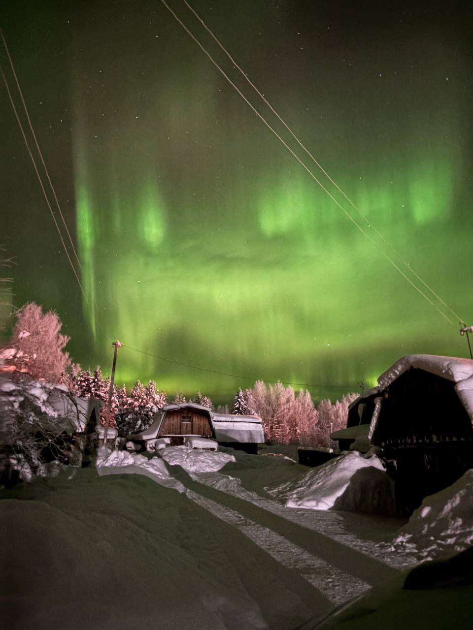 Красивое свечение отмечали не только в северных городах, но и южнее — в Троицко-Печорском районе, например, в поселке Якша. Фото опубликовано в группе ""Инцидент Ухта | Коми".