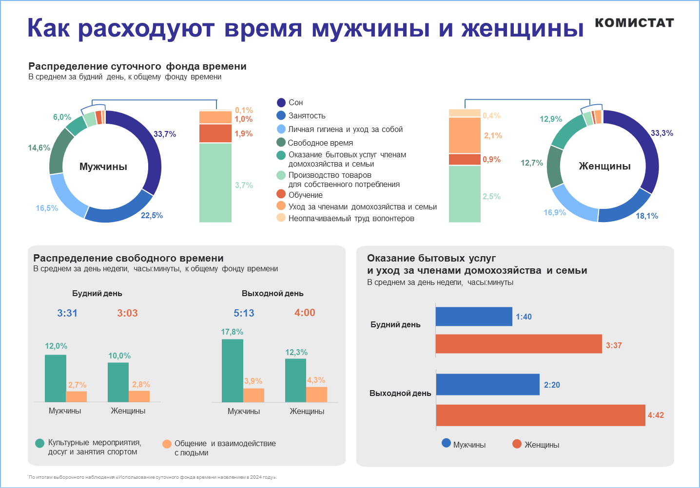 Основные различия в структуре суточного фонда времени между мужчинами и женщинами наблюдаются в сфере занятости и ведения домашнего хозяйства. Так, в будни мужчины тратят на основную работу 22,5% времени, что значительно больше, чем женщины (18,1%). При этом мужчины также больше времени уделяют обучению (1,9% против 0,9%) и производству товаров для себя (3,7% против 2,5%).