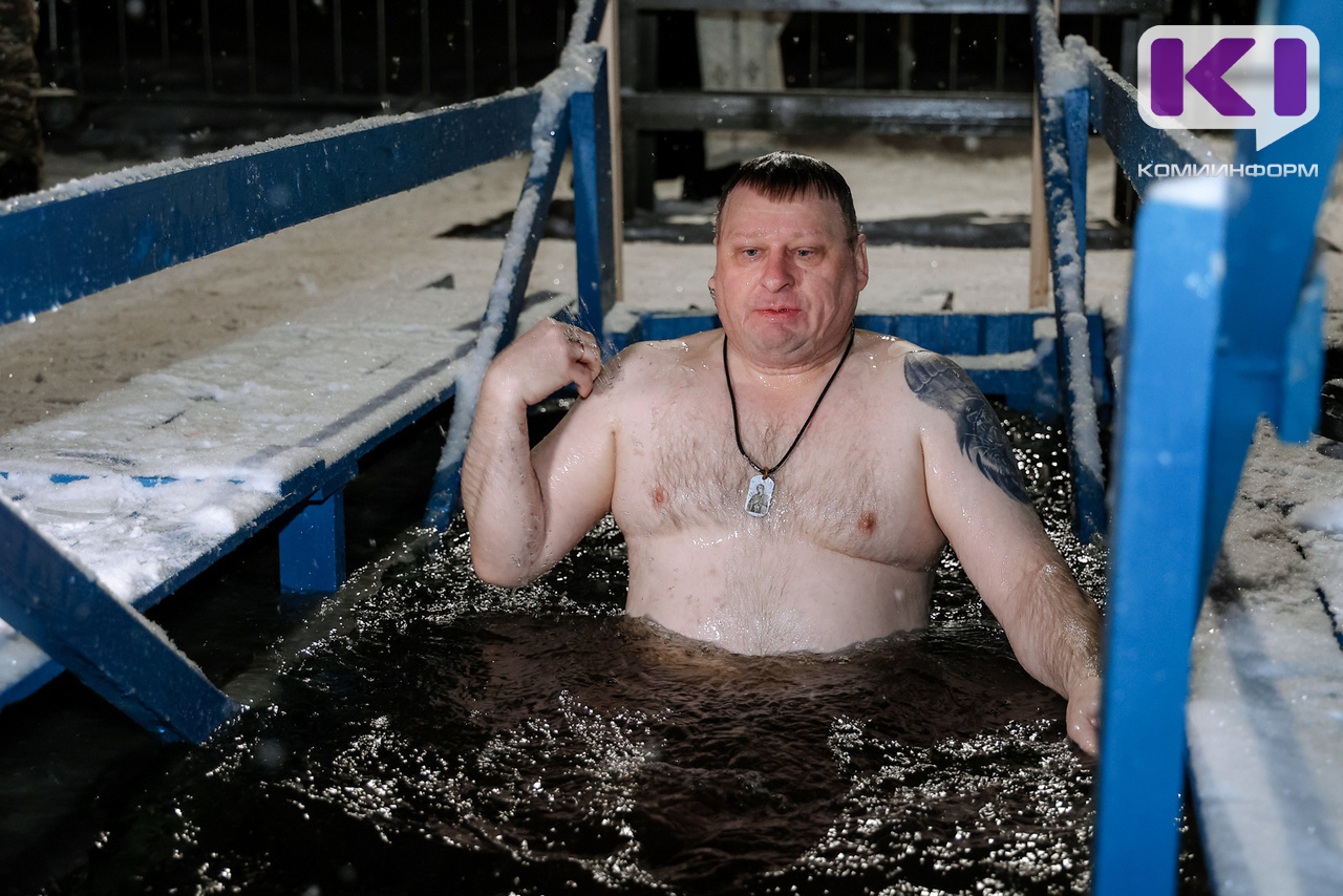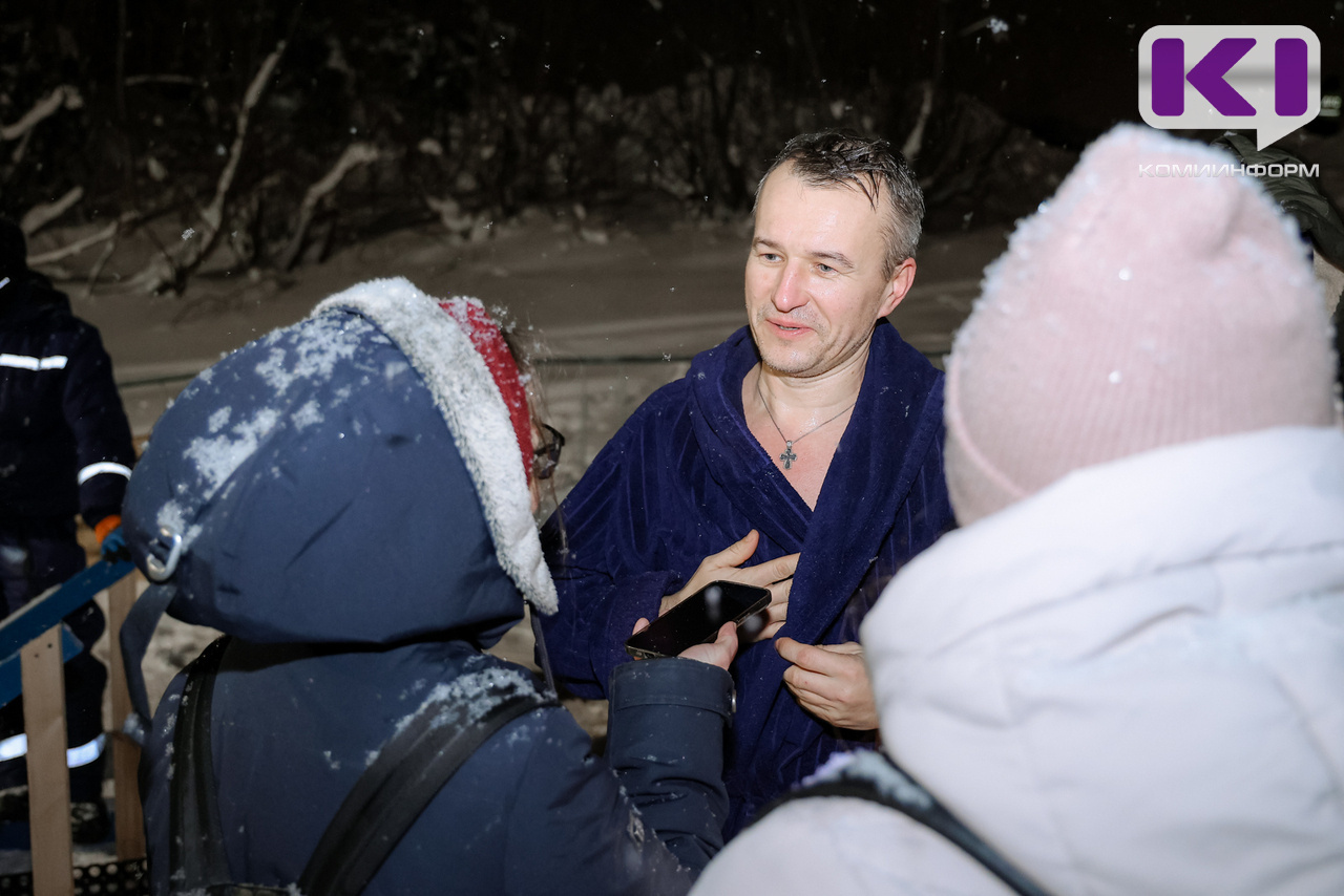 После чина Великого освящения воды пришла очередь верующих, которые пришли окунуться в прорубь на Крещение. Одним из первых в прорубь вошел начальник Главного управления МЧС России по Коми Алексей Пархомович, он отметил, что вода - замечательная.