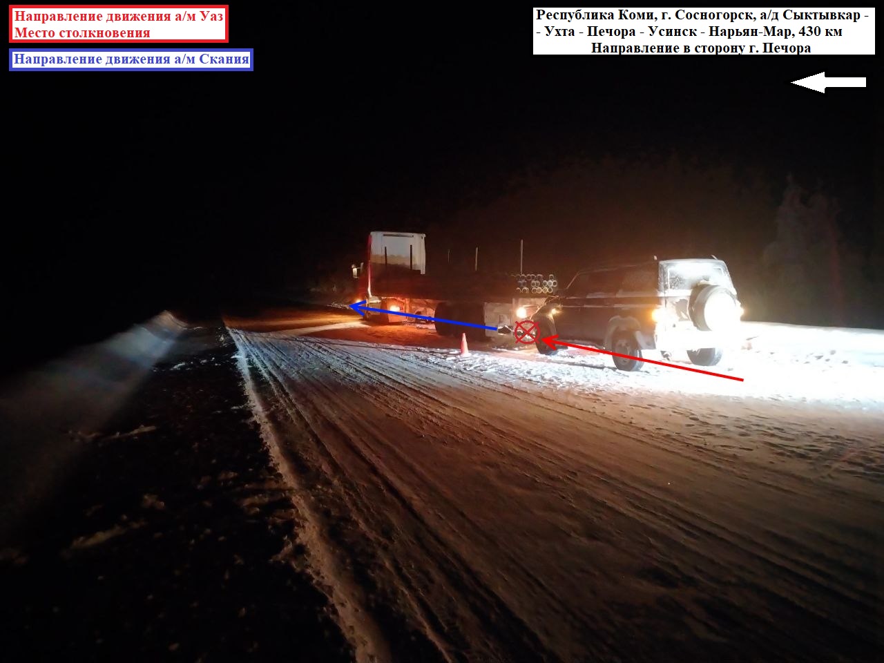 В 17:45 водитель 2001 г.р., управляя машиной "УАЗ Патриот", двигаясь по трассе Сыктывкар-Нарьян-Мар в направлении Печоры, на 430 км дороги не учёл безопасную дистанцию до попутной Scania с прицепом под управлением водителя 1983 г.р. и столкнулся с грузовиком.