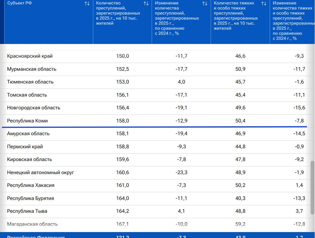 В 2025 году в регионе здесь было зафиксировано 158,0 преступления на 10 тыс. жителей. Этот показатель на 12,9% ниже, чем в 2024 году. Количество тяжких и особо тяжких преступлений в республике сократилось на 7,8% (50,4 случаев на 10 тыс. жителей за 2025 год). Отметим, что в прошлом году регион также занимал 71-ю строчку рейтинга.