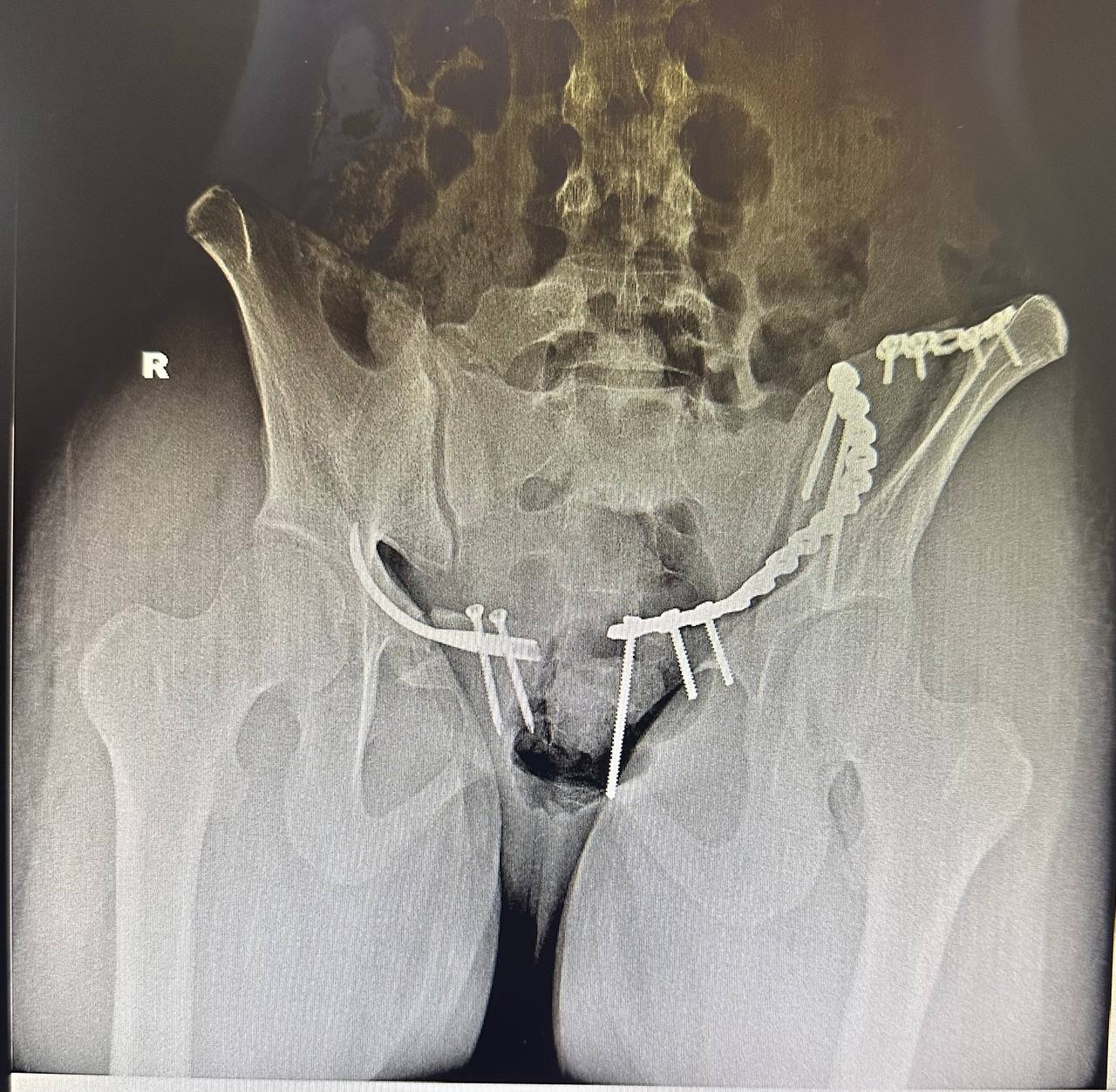 После стабилизации состояния пациентке в ходе одной операции выполнили два вида остеосинтеза: интрамедуллярный блокируемый малоинвазивный остеосинтез лонной кости справа и накостный остеосинтез крыла подвздошной кости слева. Хирургическое вмешательство позволило восстановить опороспособность таза.