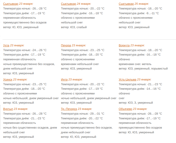 В Сыктывкаре 23 января переменная облачность. Преимущественно без осадков. Ветер южный, юго-западный 3-8 м/с. Температура ночью -26...-28°С, днем -17...-19°С.