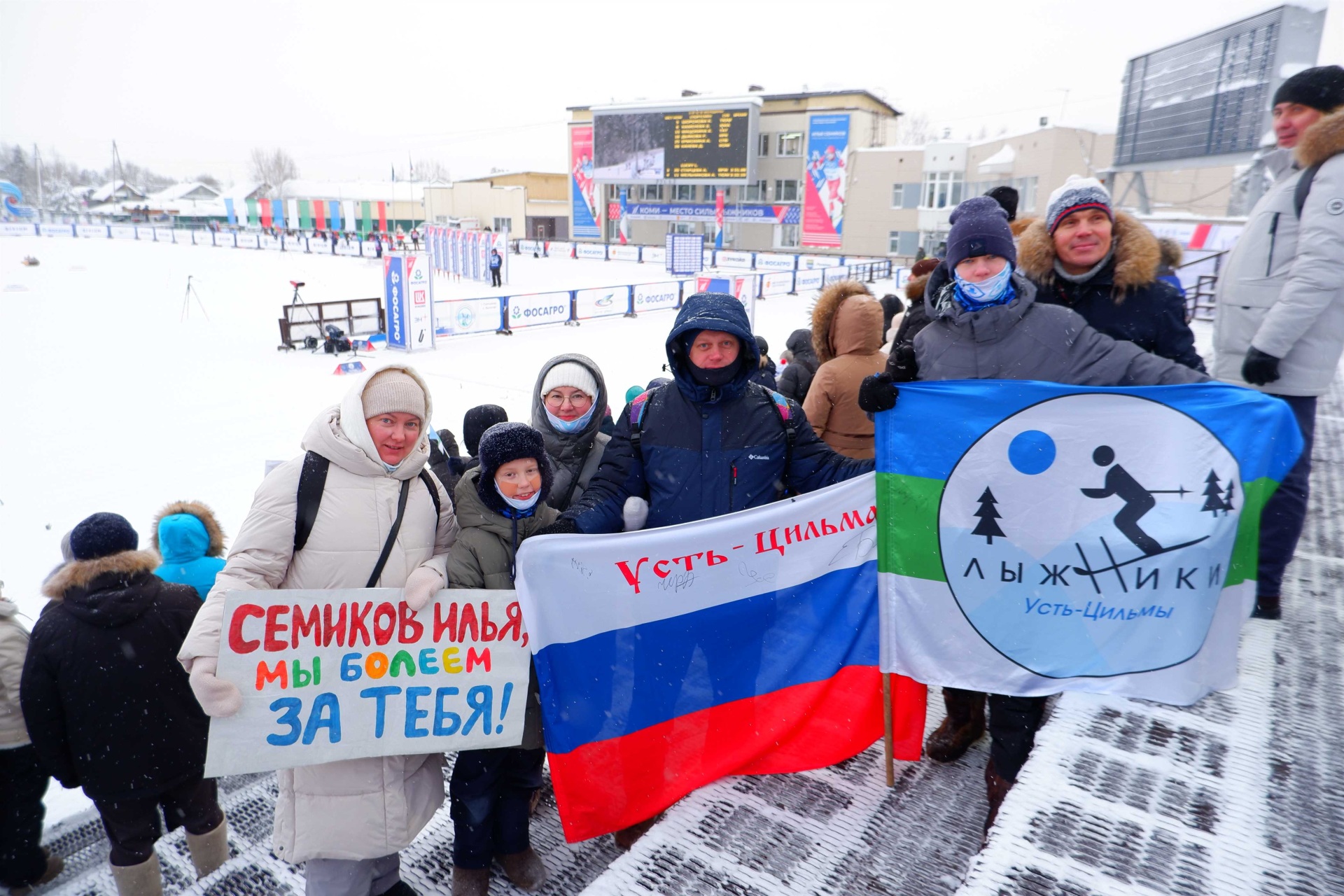 Болельщики активно поддерживают спортсменов, создавая яркую атмосферу спортивного праздника с помощью плакатов и речевок.