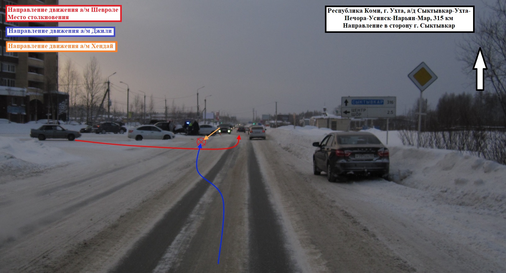 ДТП произошло 25 января около 11:50. Водитель 1994 года рождения за рулем Chevrolet ехал по проспекту Ленина со стороны проспекта Космонавтов в направлении автодороги "Сыктывкар-Ухта-Печора-Усинск-Нарьян-Мар". На 315 километре этой автодороги, выполняя маневр поворота налево со второстепенной дороги, он не уступил дорогу, в результате чего автомашина Geely, уходя от столкновения с Chevrolet, выехала на сторону дороги, предназначенной для встречного движения и совершила столкновение с автомашиной Hyundai Creta, которая двигалась во встречном направлении.