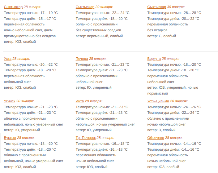 В Сыктывкаре 28 января переменная облачность. Ночью небольшой снег, днем преимущественно без осадков. Ветер юго-западный 2-7 м/с. Температура ночью -17...-19, днем -15...-17°С.