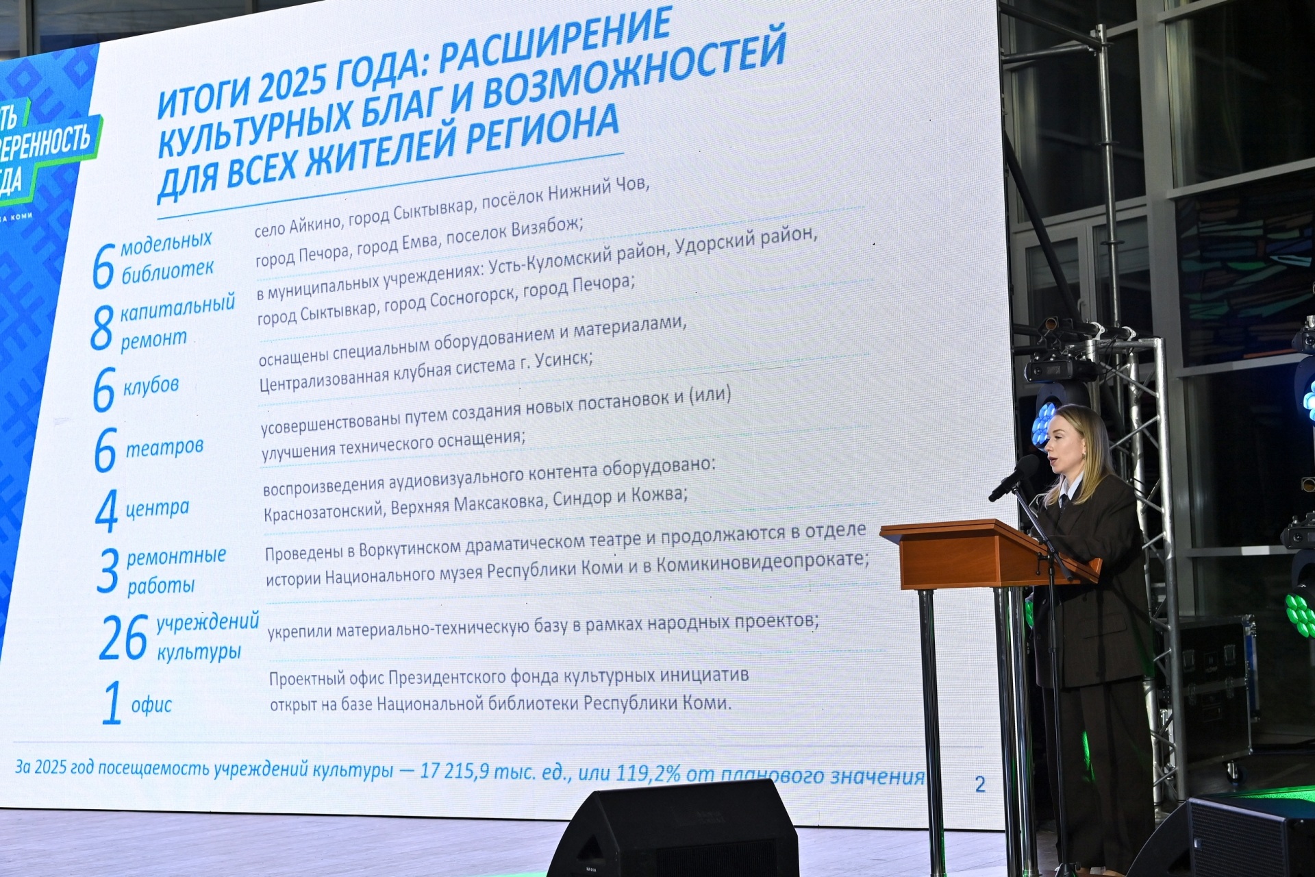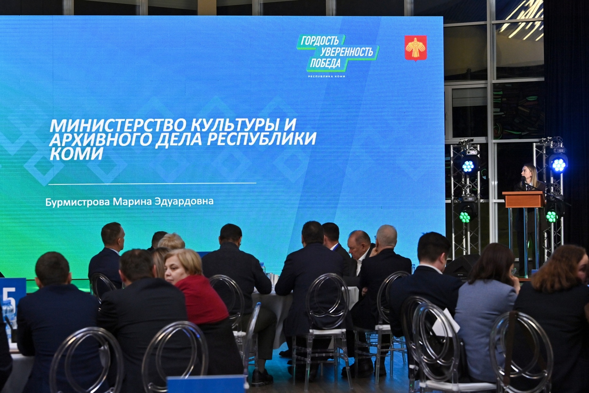 В ходе выступления министр культуры Коми Марина Бурмистрова отметила высокую значимость сохранения национального культурного наследия и особую роль крупных мероприятий региона. Среди них прозвучали XXII Фестиваль театров малых городов России, Международный фестиваль искусств "Кандинский", этнофестиваль "Люди леса" и традиционный праздник народного художественного творчества "Шондiбан".