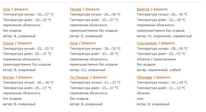 В Сыктывкаре облачно с прояснениями. Ночью преимущественно без осадков, утром и днем небольшой снег. Ветер восточный 4-9 м/с. Температура ночью -22...-24°С, к утру -15...-17°С, днем -11...-13°С.