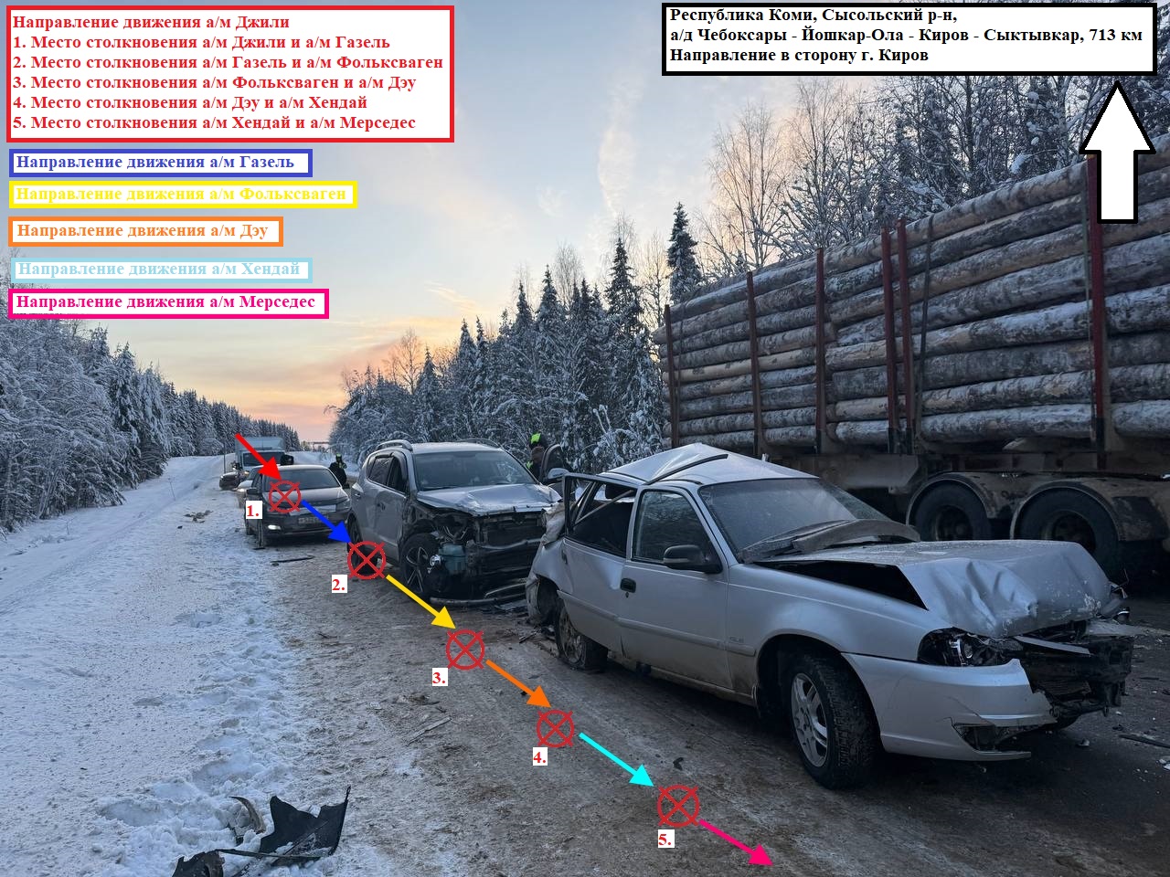 Напомним, ДТП произошло вчера, в 13:45. Водитель 1975 года рождения, управляя Geely, двигался по дороге Чебоксары - Йошкар-Ола - Киров - Сыктывкар со стороны Кирова в направлении Сыктывкара. На 713-м км дороги мужчина не учел безопасную дистанцию до движущегося впереди в попутном направлении транспорта, в результате чего столкнулся с ГАЗель Next, которая столкнулась со стоящей на обочине Volkswagen Polo, а та - с движущейся впереди Daewoo Nexia, которая, в свою очередь столкнулась с Hyundai Solaris. Последний врезался в стоящую впереди Mercedes-Benz.