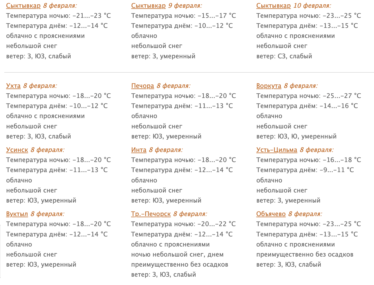 В Сыктывкаре 8 февраля облачно с прояснениями. Небольшой снег. Ветер западный, юго-западный 2-7 м/с. Температура ночью -21…-23°С, днем -12...-14°С.