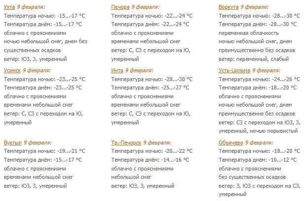 В понедельник будет облачно с прояснениями. Небольшой снег. Местами гололедно-изморозевое отложение, на крайнем северо-востоке временами туман. Ветер западной четверти 4-9 м/с, ночью на северо-западе порывами до 13 м/с. Температура ночью -15...-20°С, при прояснении -25...-30°С, днем -11...-16°С, в северных районах -18...-23°С, на крайнем северо-востоке ночью и днем -25...-30°С.