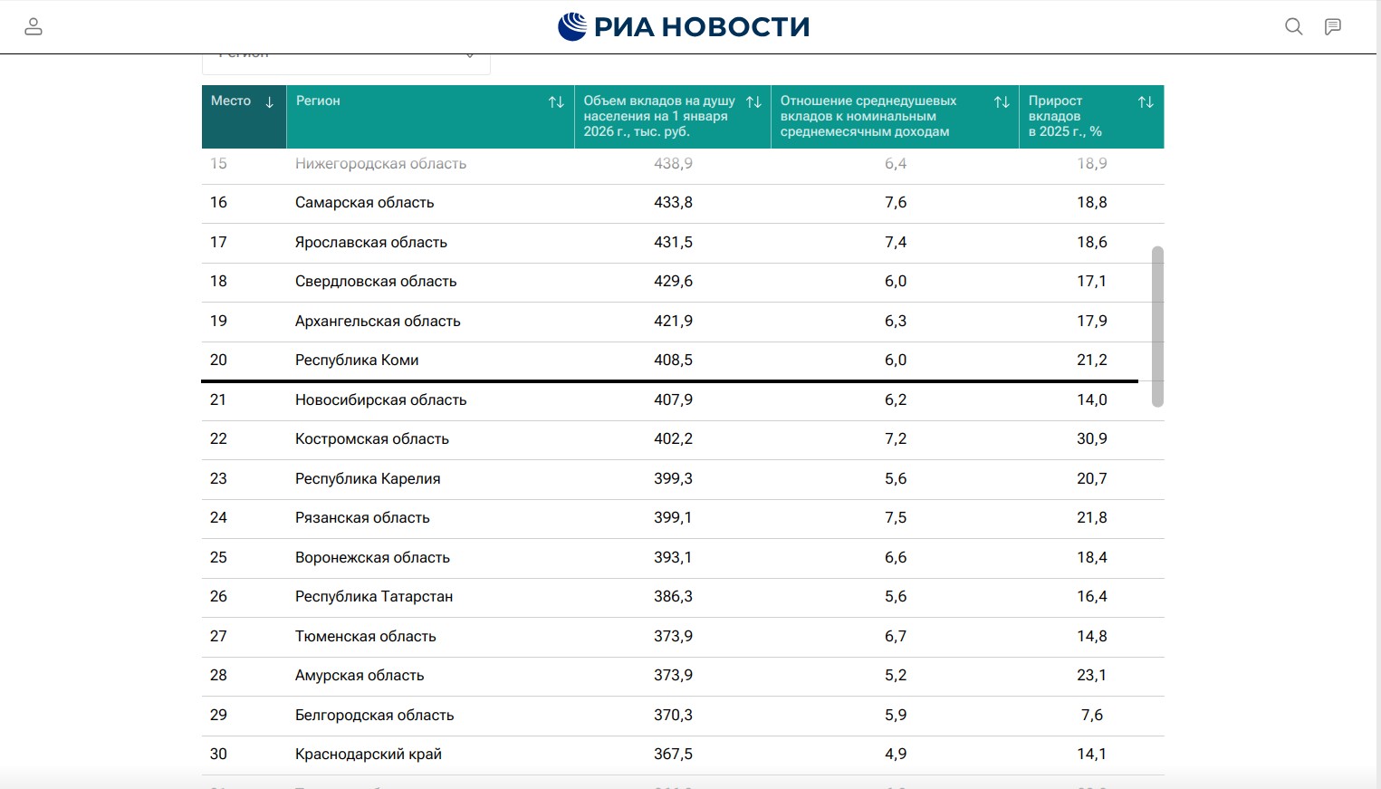 Республика Коми оказалась на 20-м месте в рейтинге регионов по банковским вкладам, свидетельствуют результаты исследования РИА Новости.