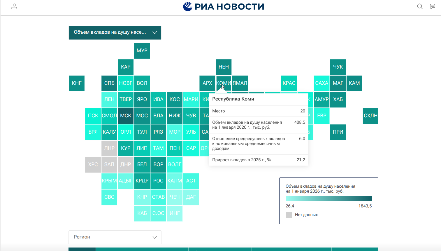 На 1 января 2026 года на одного жителя приходилось 408,5 тысяч рублей, что на 21,2 % больше показателя прошлого года. Сумма вкладов жителей региона равна 6 номинальным среднемесячным доходам.