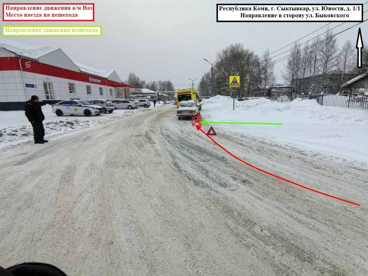 Как сообщили "Комиинформу" в Управлении Госавтоинспекции по Коми, происшествие случилось 12 февраля в 14:50. 62-летний мужчина, управляя автомобилем ВАЗ-2107, двигался по ул.Островского со стороны ул.Молодежной в направлении ул.Юности. Напротив дома №1/1 по ул.Юности, выполняя правый поворот на нерегулируемом перекрестке, водитель "семёрки" сбил женщину, которая переходила проезжую часть вне пешеходного перехода,  поворот направо, на пешехода, переходившего проезжую часть вне зебры, но в зоне видимости пешеходного перехода.