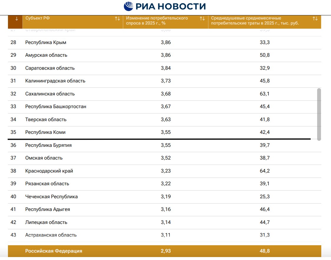 Лидером рейтинга стал Чукотский АО, где годовое значение динамики потребительского спроса составило +13,86%. Следом расположились Магаданская область (+10,15%), Удмуртия (+9,22%), Кабардино-Балкария (+8,92%) и Мордовия (+8,55%).