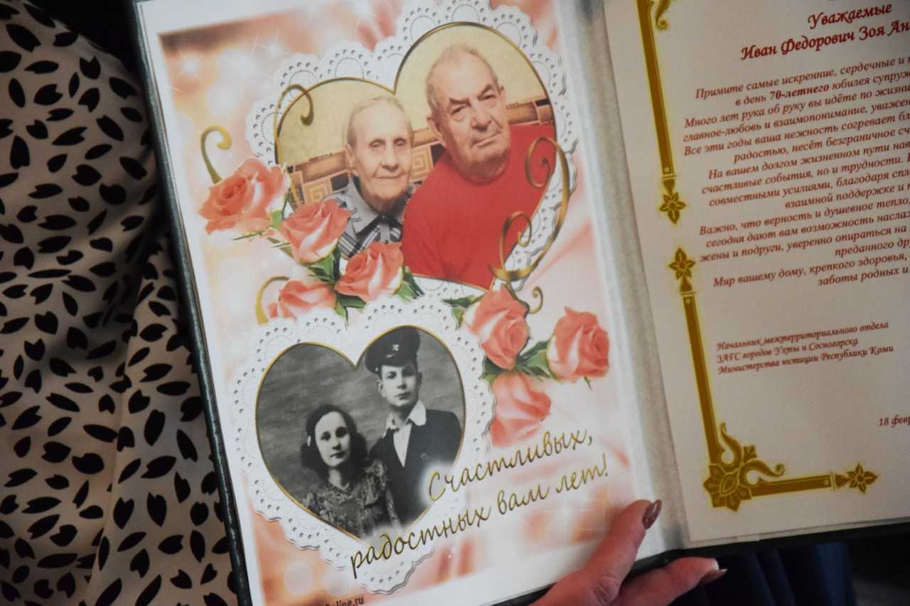 Уникальное событие произошло в Ухте: межтерриториальный отдел ЗАГС Ухты и Сосногорска чествовал супругов Зубковых - Ивана Федоровича и Зою Андреевну, которые отметили 70-летие совместной жизни. Годовщина, именуемая "благодатной свадьбой", является огромной редкостью и символом настоящей верности. За плечами юбиляров немалый трудовой и жизненный путь, сообщает Минюст Коми.